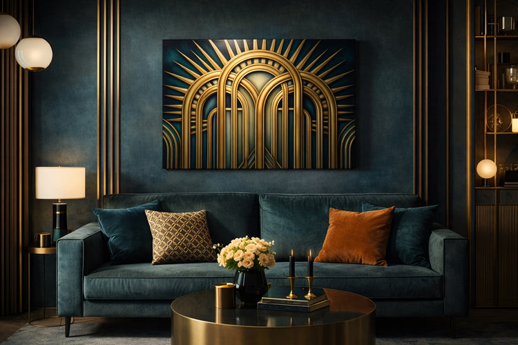 Ce tableau art déco met en scène une succession d’arches dorées parfaitement symétriques, évoquant à la fois les halls monumentaux, les portails cérémoniels et les décors emblématiques de l’âge d’or des années 1920. Les lignes courbes, répétées avec précision, créent une profondeur visuelle saisissante et une impression de puissance architecturale intemporelle.