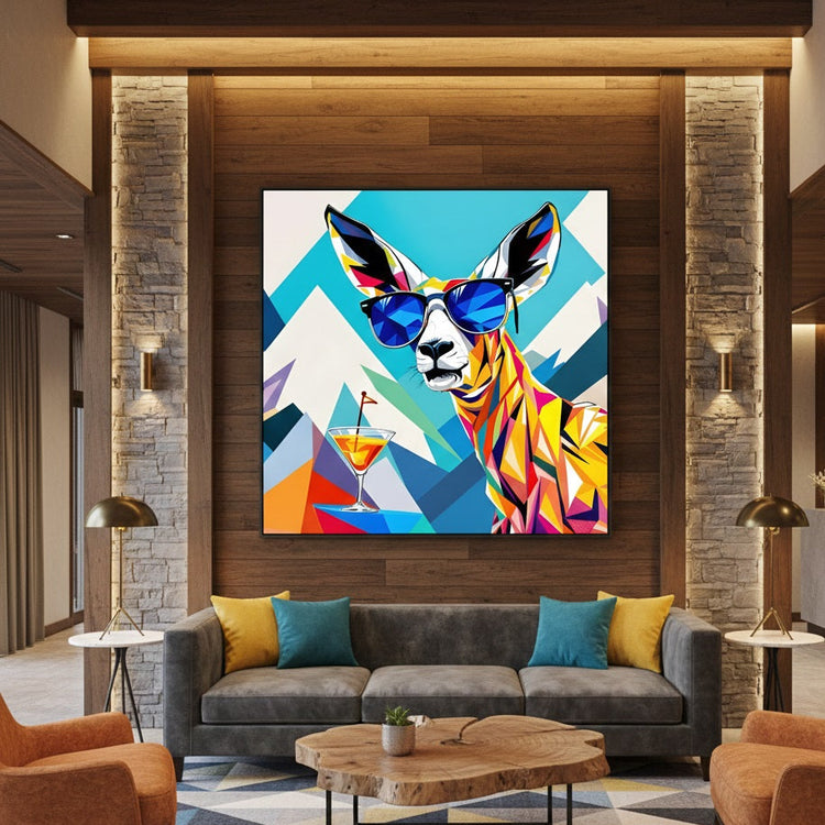Ce tableau animal revisité met en scène un lama au look ultra contemporain, lunettes bleu profond et attitude cool, comme figé dans un instant de détente chic. L’arrière-plan n’est pas un simple décor : on retrouve bien un fond de montagnes géométriques, construit en aplats anguleux et formes graphiques, qui donne une vraie profondeur et une esthétique très design. Les triangles et volumes stylisés évoquent des sommets modernes, presque futuristes, et renforcent le contraste entre nature et pop culture.