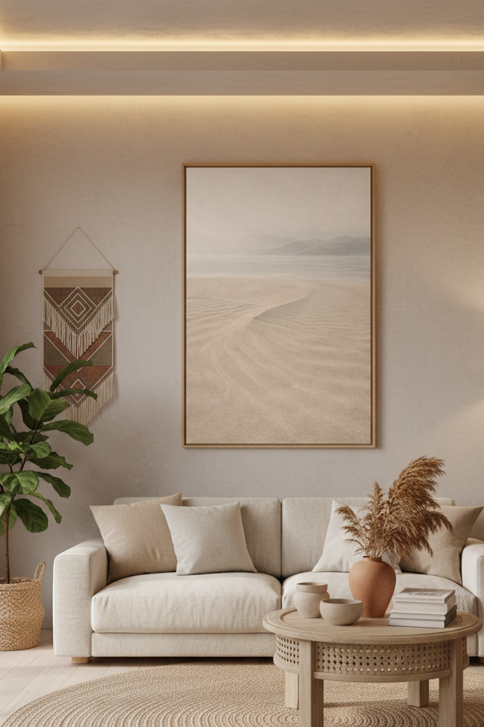 La composition repose sur des tons clairs et organiques : beige sable, blanc cassé et ivoire lumineux. Ces couleurs subtiles se fondent dans une brume légère qui adoucit l’horizon et renforce la sensation de profondeur. L’ensemble crée une ambiance visuelle très douce, idéale pour instaurer une atmosphère apaisée et équilibrée dans votre intérieur.