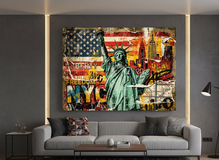 Cette création met à l’honneur l’un des symboles les plus puissants au monde : la Statue de la Liberté. Représentée dans un style collage urbain, elle se détache sur un fond mêlant drapeau américain, skyline new-yorkaise et typographies graphiques. L’ensemble évoque l’énergie brute de New York, entre culture pop, histoire et modernité.