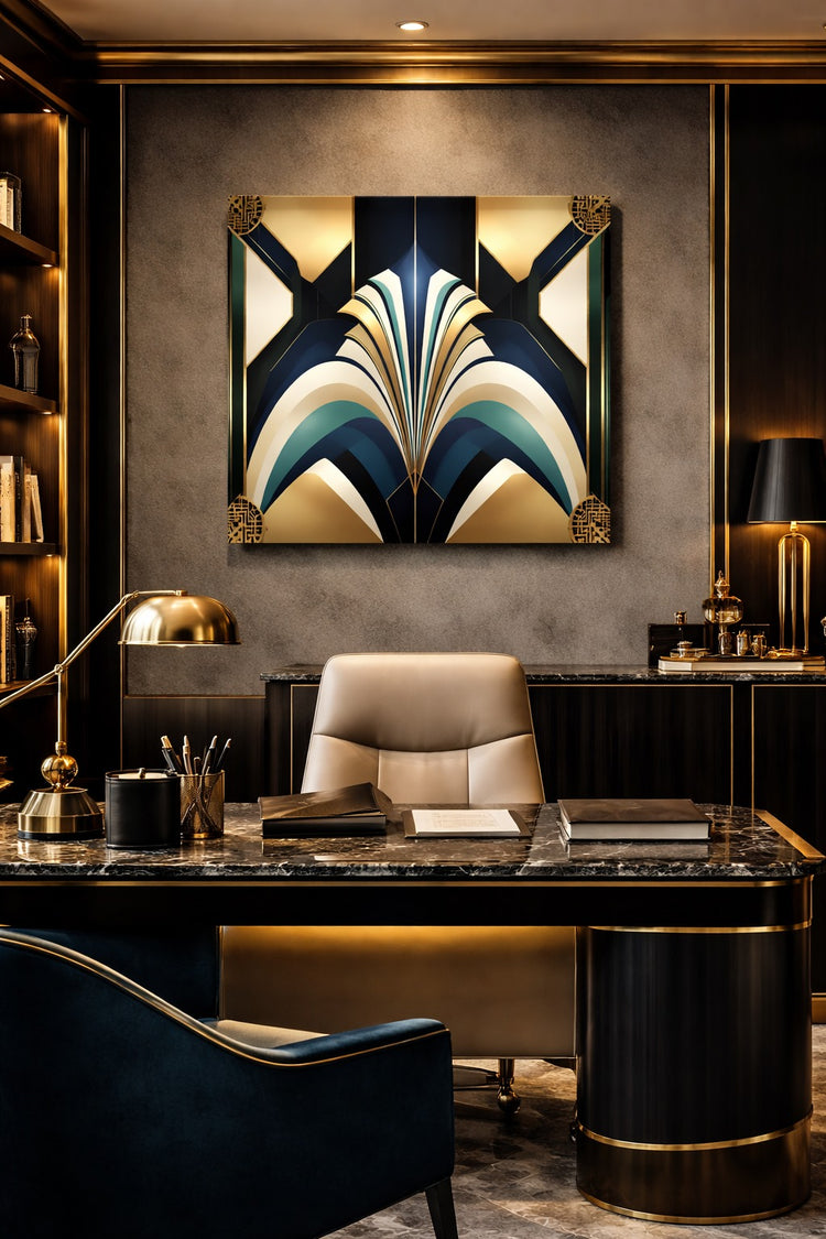 Ce tableau abstrait ne se contente pas de reprendre les codes historiques de l’Art Déco : il les modernise. Les lignes géométriques rappellent les motifs décoratifs des années 30, tandis que la composition symétrique et les couleurs profondes l’ancrent dans une esthétique actuelle. C’est un tableau qui traverse les tendances, pensé pour durer dans le temps sans jamais lasser.