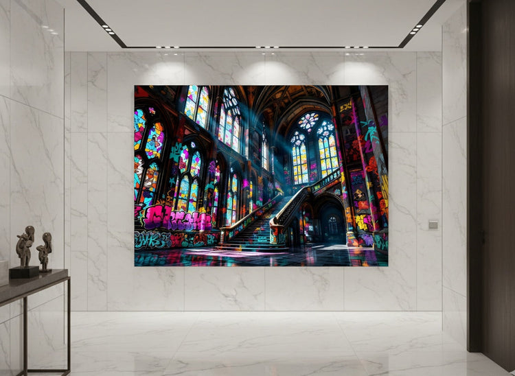 Les vitraux diffusent une lumière intense composée de bleu électrique, rose magenta, jaune lumineux et turquoise éclatant. Les rayons traversent l’espace et illuminent les surfaces couvertes de graffiti, de signatures urbaines et de motifs colorés. Le contraste entre l’architecture noble et l’énergie du graffiti sur toile crée une ambiance visuelle particulièrement forte.