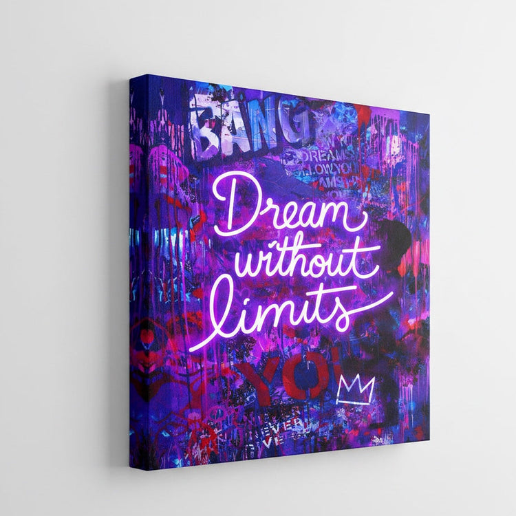 Cette création joue à fond la carte du pop art contemporain : un lettrage façon néon “Dream Without Limits” qui surgit d’un mur saturé de graffiti, de coulures et de textures. Le violet électrique, le bleu profond et les touches rouges donnent un rendu ultra urbain, comme une affiche arrachée dans une ruelle underground. On est sur une composition typographique street-pop, très graphique, pensée pour devenir la pièce maîtresse de votre décoration murale.
