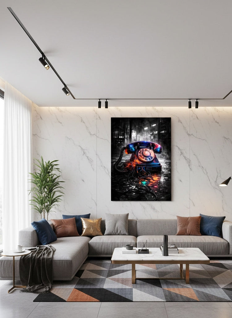 Pensé comme une décoration murale lumineuse, ce tableau capte immédiatement le regard et crée une ambiance forte, presque narrative. Il évoque l’attente, le silence, le moment suspendu avant un appel décisif, transformant un simple objet en symbole visuel puissant.
