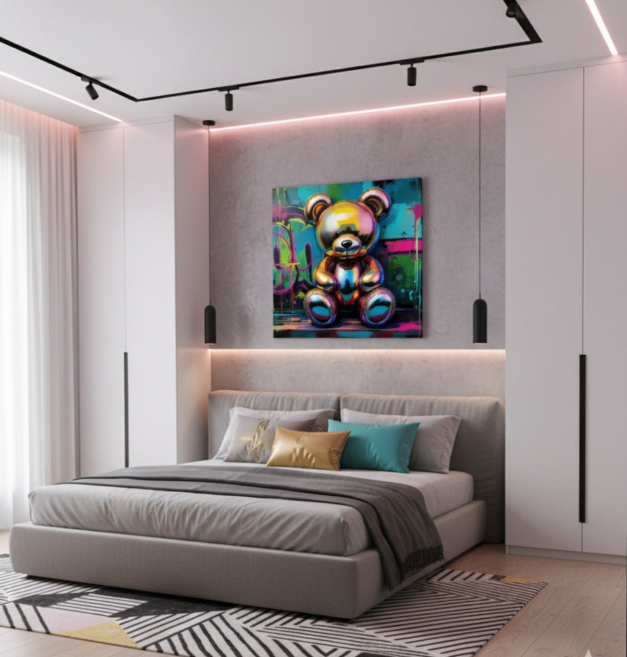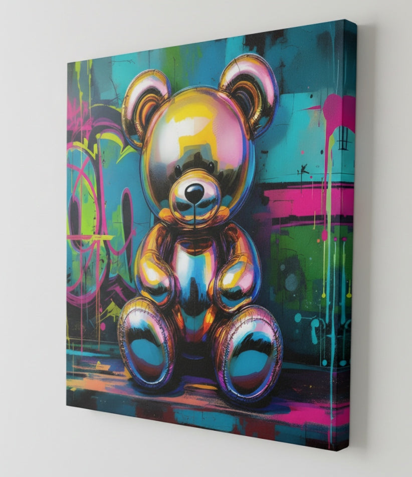 Ce tableau pop art street art met en scène un ours iconique au rendu chromé et ultra coloré, inspiré des codes du pop art contemporain et de l’art urbain.