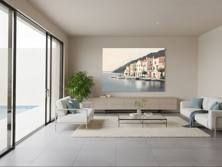 Ce tableau propose une lecture contemporaine de Port Grimaud, sans chercher la carte postale. L'image privilégie l'harmonie des volumes, la douceur des teintes et la sensation d'espace, pour créer une œuvre élégante et intemporelle.