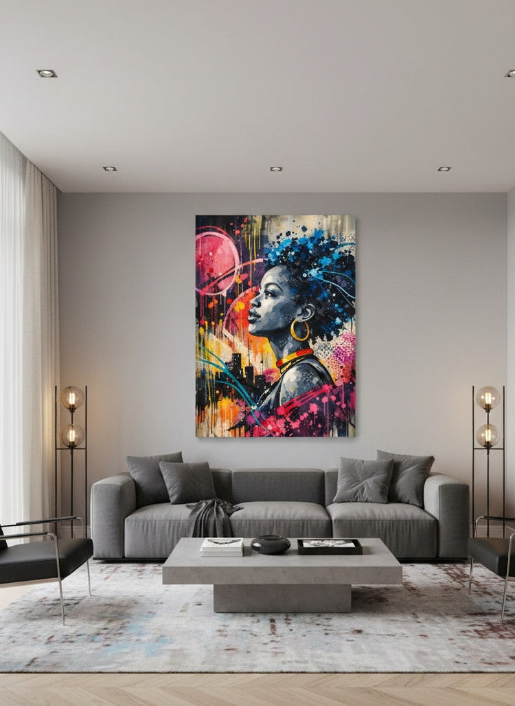 Idéale pour un salon design, un bureau créatif ou un intérieur contemporain affirmé, cette pièce s'adresse aux amateurs de portrait moderne street art , de déco murale urbaine colorée et d'art expressif féminin.