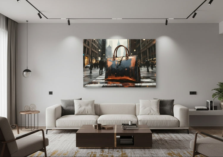 Ce tableau met en scène un sac iconique revisité, posé au cœur d’une avenue new-yorkaise, comme une œuvre à part entière. Détourné de sa fonction première, l’objet devient ici un symbole de puissance, de réussite et d’audace contemporaine. Le contraste entre le cuir luxueux, marqué par des éclats de matière, et l’agitation urbaine environnante crée une tension visuelle forte, immédiatement captivante. Ce tableau décoratif s’adresse à celles et ceux qui aiment les objets forts, chargés de sens, et qui veulent une pièce murale capable d’affirmer un style sans compromis.